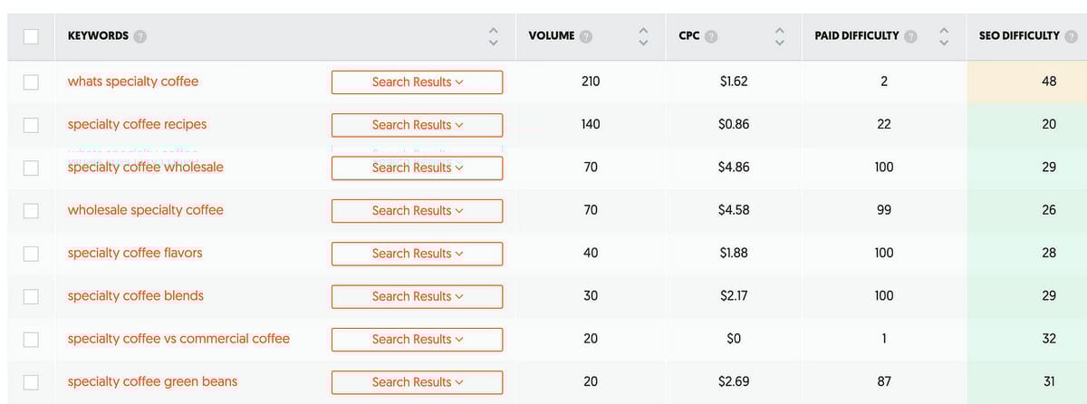 All that’s left to do is to find low-competition keywords that answer questions about specialty coffee, so let’s bring in Ubersuggest (I find it easier than Semrush):