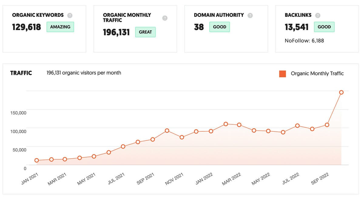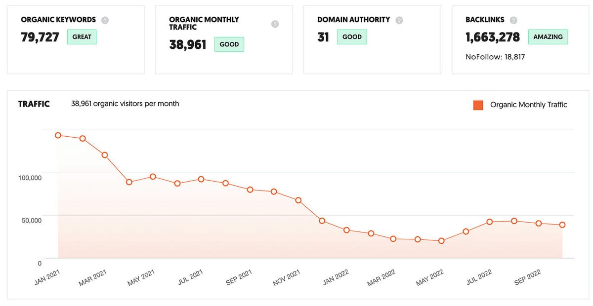 Search traffic and profit has been on a decline but looks to be bottoming, October revenue from Mediaving / Amazon Associates is claimed to be $1,096 which puts the asking price at exactly 45x monthly profit. These multiples were common 6 months ago, but with the current situation of less buyer liquidity, a lower offer could be accepted, especially as the new owner will not quality for Mediavine. Top page brings in 12% search traffic according to Semrush, but it’s mostly a lot of images. 205 pages in google index.