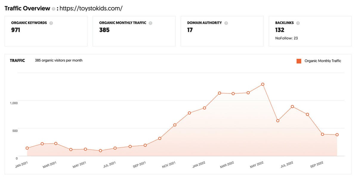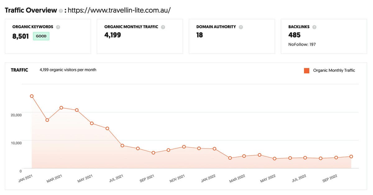 Search traffic looks to have fallen off a cliff, but also looks to have stabilized over the last couple of months. The Flippa listing is actually showing an increase in revenue in October over September, now at $147, which puts the reserve price at a 22x monthly profit multiple.