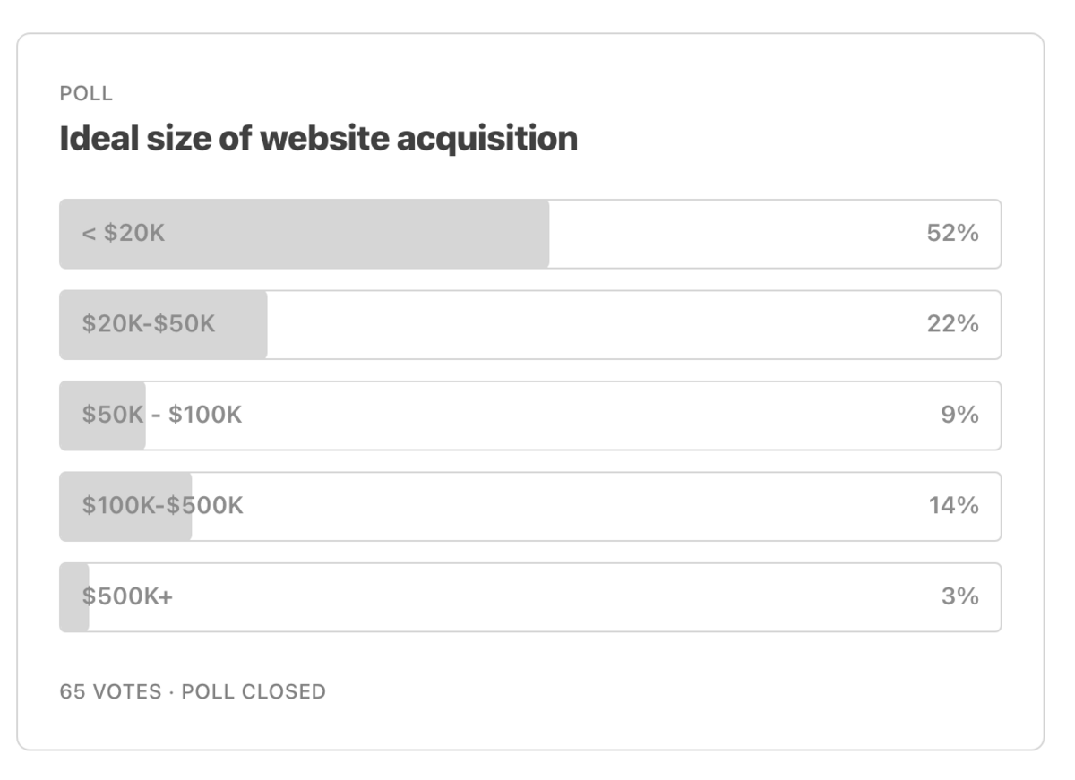 And this one surprised me, with the majority of subscribers looking for sub $20K acquisitions, although 14% are in the low to mid-six-figure range, which based off my 1450 subscribers is still a very healthy 200+ acquirers: