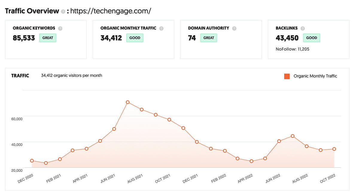 Site looks like may have been hit by the July 2022 product reviews Google update but has recovered somewhat, now 50% at its peak. However, looking at the listing description, it mentions that brands pay to be featured, so would need to look into whether that translates into dofollow links.
