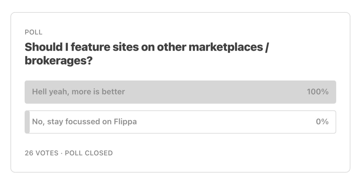 Last week’s poll on whether I should feature additional listings outside Flippa was unanimous: